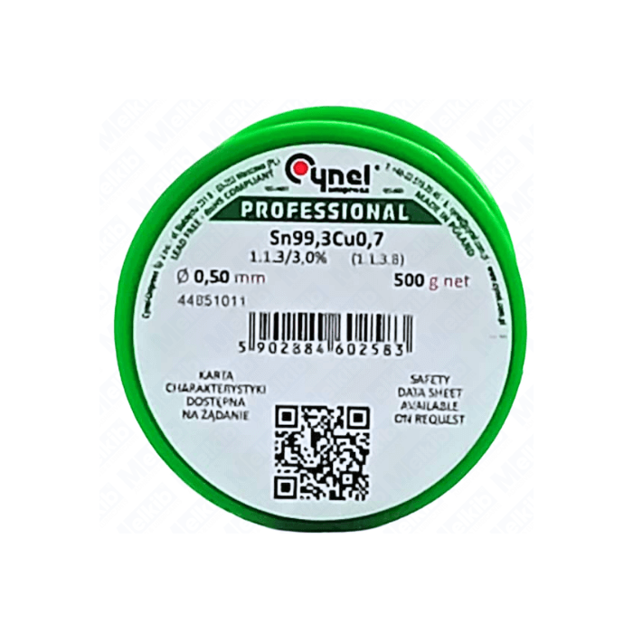 Pájecí drát Sn99.3Cu0.7-1.1.3 je vysoce kvalitní bezolovnatá pájka určená pro měkké pájení. Vyrobeno z cínu (99,3 %) a mědi (0,7 %), splňuje požadavky normy EN ISO 9453: 2014. Díky použití tavidla na bázi kalafuny 1.1.3 zajišťuje vynikající smáčivost a spolehlivé spoje. Výrobek splňuje směrnici RoHS2, což znamená, že neobsahuje škodlivé látky, jako je olovo.