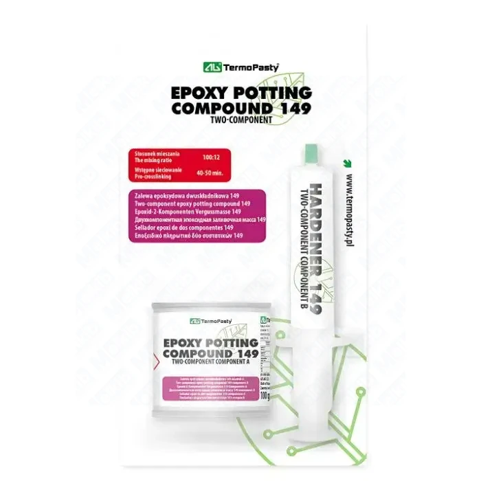Dvoukomponentní epoxidová zalévací hmota 149 100 g je pokročilý kondenzující materiál, který díky vynikajícím elektroizolačním a mechanickým vlastnostem poskytuje spolehlivou ochranu elektronických součástek před vlhkostí, prachem a vnějšími vlivy.