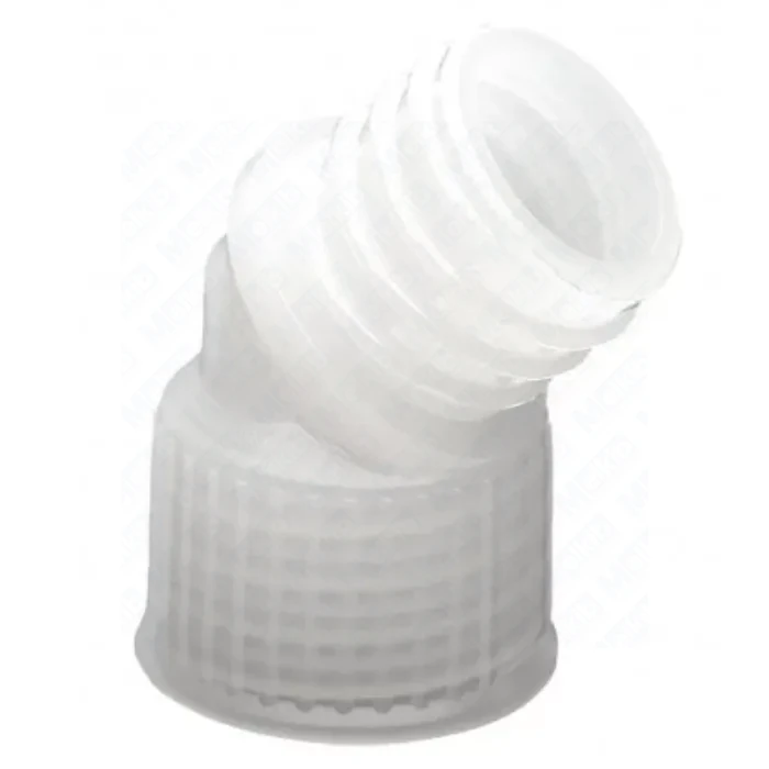 Melkib Cartridge adaptor elbow 45° S15 to S15 je kolínkový adaptér 45° pro aplikaci v hůře dostupných místech. Změna směru dávkování pod úhlem 45° usnadňuje přesné vedení housenky v rozích, výklencích a místech s omezeným přístupem (dle popisu). Adaptér má závit S15 na obou stranách, takže propojuje dva standardní závitované komponenty S15.