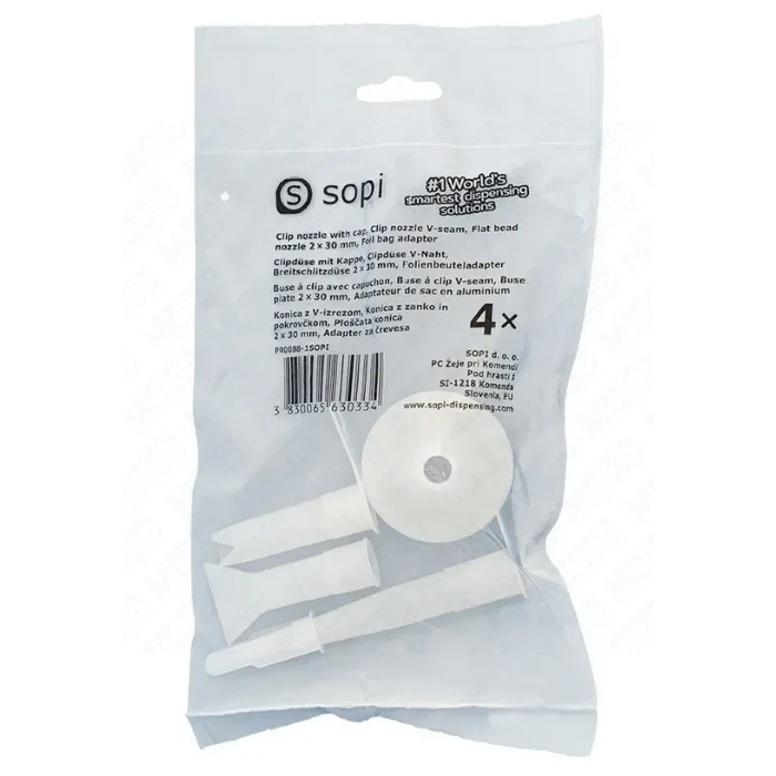 SOPI Pack, sada aplikačních trysek a adaptér pro kartuše a fóliové sáčky, clip s krytkou, V-seam, plochá 2 × 30 mm, HDPE, závit S15