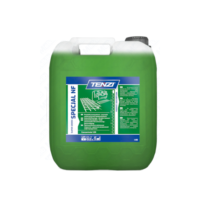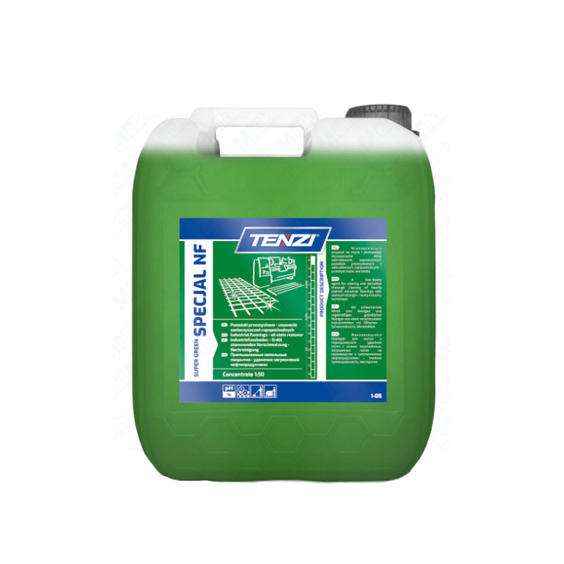 Super Green Special NF je alkalický čisticí prostředek s nízkou pěnivostí a širokým spektrem použití. Je ideální pro čištění silně znečištěných a zanedbaných průmyslových podlah, zejména tam, kde se vyskytují nečistoty na bázi oleje. Přípravek našel uplatnění zejména v opravárenských dílnách a těžkém průmyslu, kde dokáže účinně odstranit i ty nejodolnější nečistoty. Pro dosažení nejlepších výsledků se doporučuje používat jej se studenou vodou.
