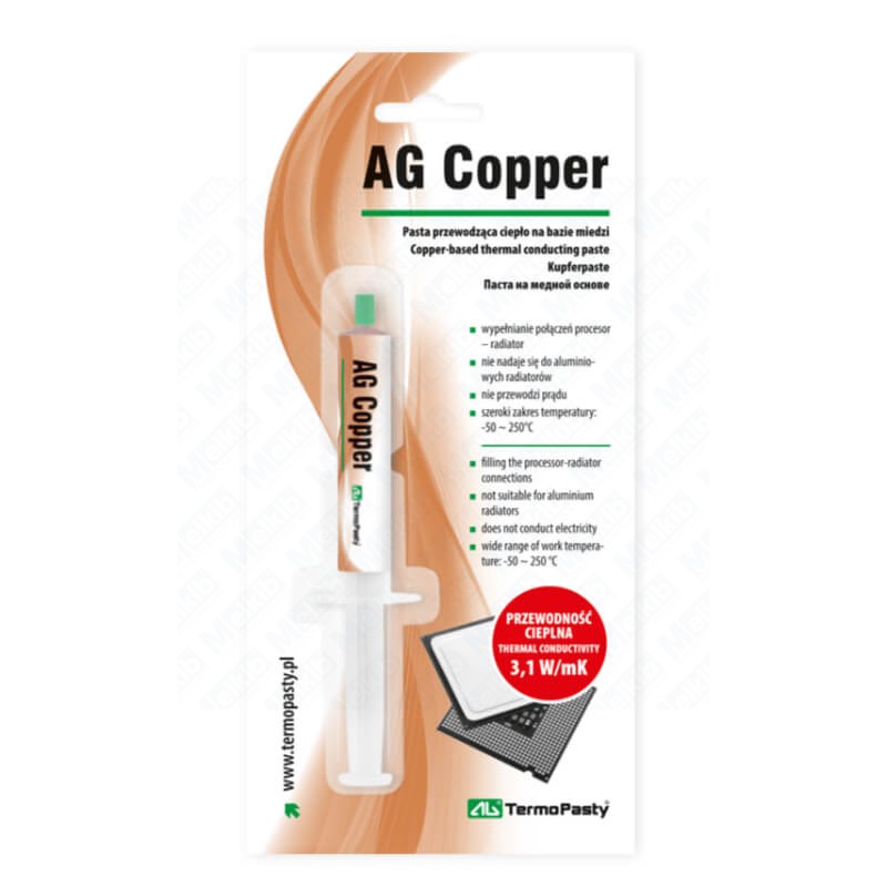 AG Copper is a unique, odorless thermal conductive paste. Mainly based on copper, it benefits various cooling systems, especially when it comes to optimizing the processor-heatsink connection. This unique paste offers an effective solution that effectively increases cooling efficiency by improving heat conduction.