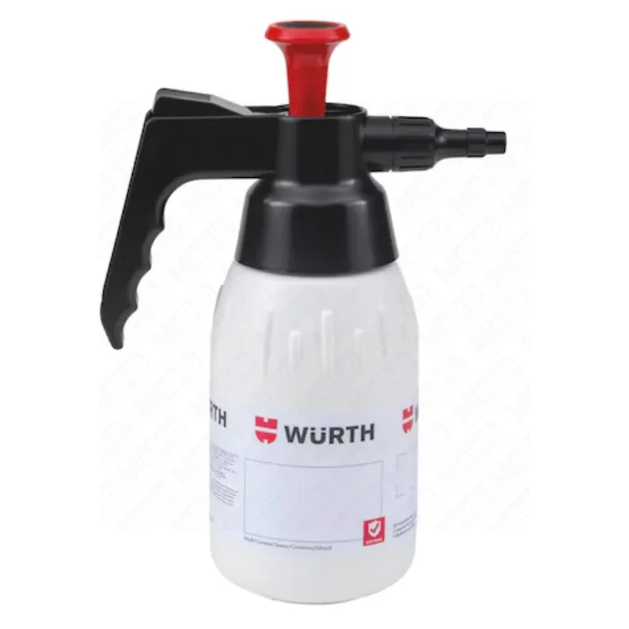 Acid-resistant pressure spray bottle – 1 L is a refillable container for convenient dispensing of acidic cleaners (pH approx. 0.5–6.5) from cans or drums. Its ergonomic long-lever trigger and stable conical body make safe workshop/MRO use easy.