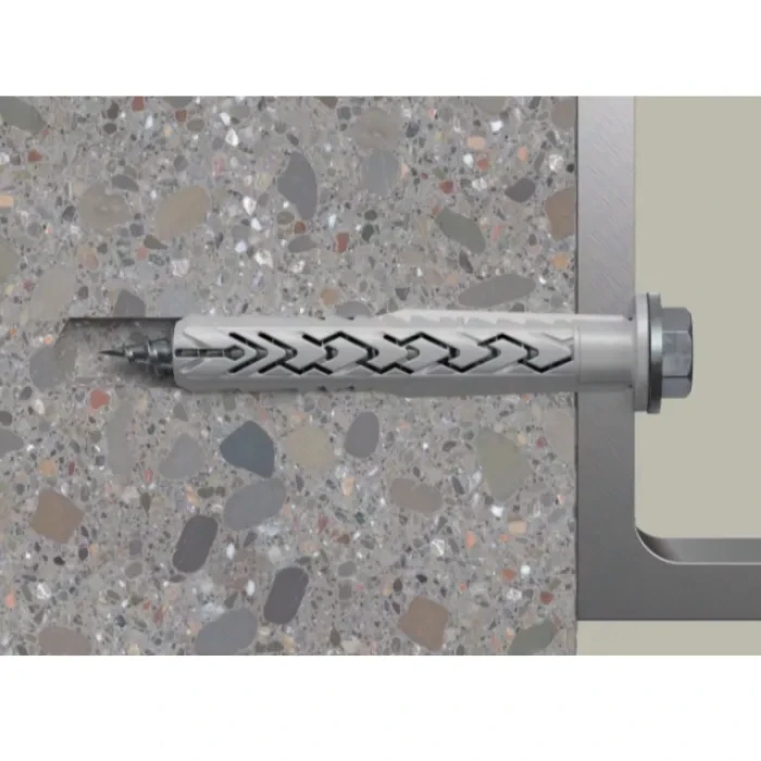 Fischer SXRL 10 × 200 FUS frame fixing with hex-head screw and integrated washer is a versatile solution for multiple fixings of non-structural elements in concrete and masonry. Its long expansion section and special geometry provide even load distribution and secure installation, also in thin-walled substrates.
