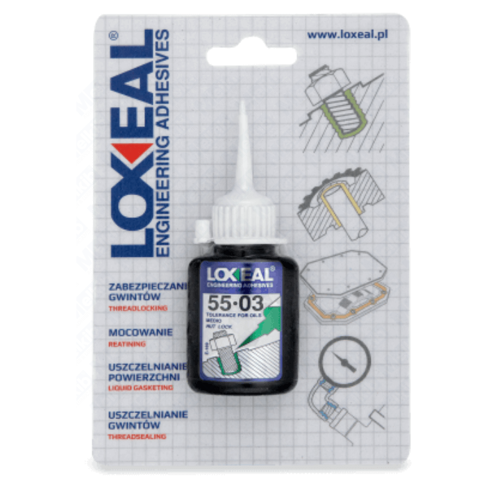 LOXEAL 55-03 is a one component anaerobic threadlocker for medium size threads against self loosening, loosening, leakage and corrosion. Hardening of the product takes place after cutting off the supply of air (oxygen) in the gap between the two metal surfaces (in the thread). The adhesive is particularly useful on less active surfaces, e.g. stainless steel, chrome-plated surfaces, and it is permissible to use the adhesive on slightly oily surfaces (new in anaerobic adhesives). The product has proven resistance to loosening up to a temperature of + 200oC. Loxeal 55-03 is approved as a gas thread sealant in accordance with the European standard EN 751-1 (DVGW No. NG-5146AU0399 and GAZ DE FRANCE). It is approved for drinking water (TZW - WRAS). The product maintains its properties unchanged at temperatures from -55oC to + 200oC, and temporarily even up to + 250oC.