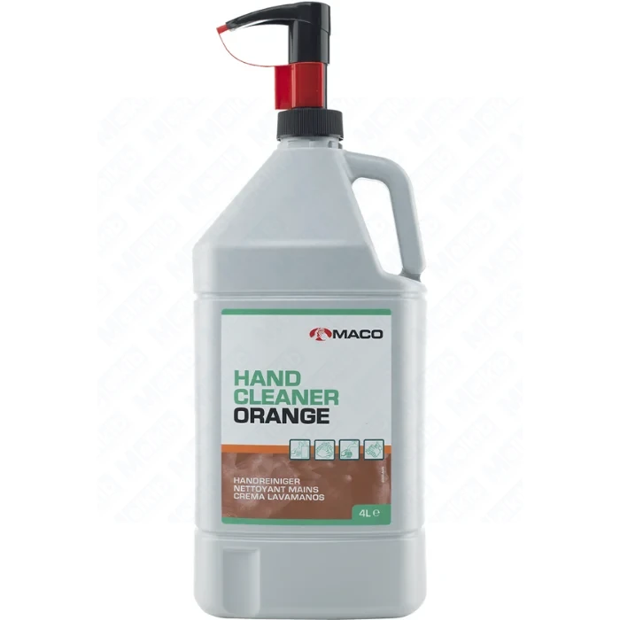 MACO Hand Cleaner Orange is a solvent-free, orange hand-cleaning gel-paste supplied in a convenient 4 L canister with a pump. It effectively removes typical workshop soils—such as greases, graphite, oils, fuels, brake fluid, rust and soot—while remaining skin-friendly thanks to a natural scrub and mild pH.