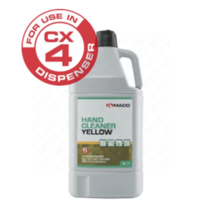 Maco Yellow 4 L CX-4 is a solvent-free citrus hand-cleaning gel with natural scrub. It quickly removes heavy industrial soils—perfect for workshops, service bays and production sites.