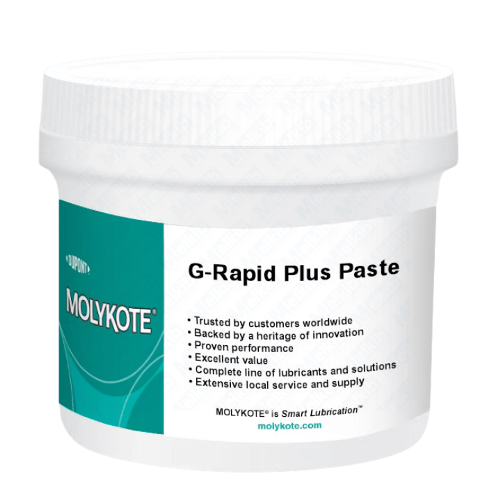 Molykote G-Rapid plus is a black assembly paste with a very high load capacity and low coefficient of friction. It consists of solid lubricants, mineral oil, graphite and MoS2 molybdenum disulfide. The paste is used for assembly and lubrication of metal parts. When applied, the paste forms a thin layer of grease on the metal surface and does not require lapping.