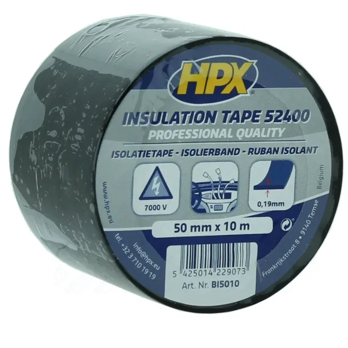 Black PVC insulation tape, 50 mm × 10 m, designed for electrical insulation and general maintenance tasks. Offers reliable tack and easy handling, even in cooler conditions.