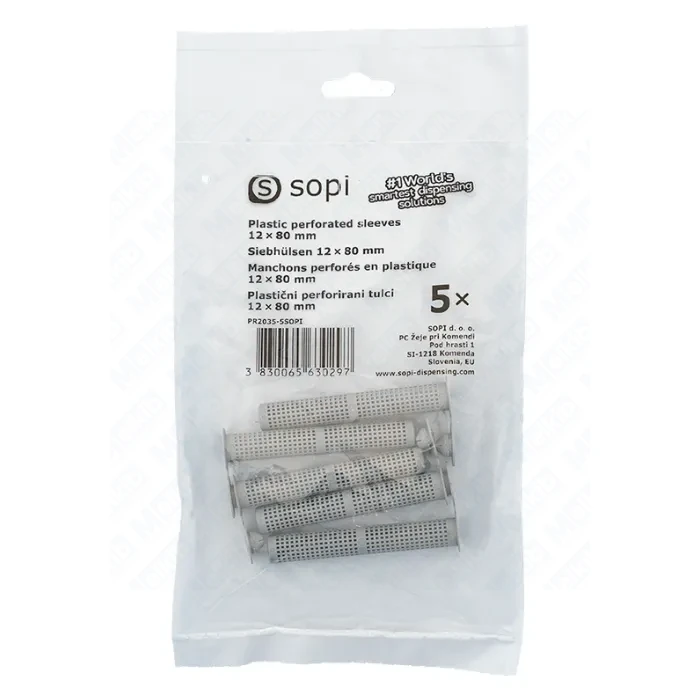SOPI Pack Plastic perforated sleeves 12 × 80 mm (5 pcs/bag) are plastic perforated sleeves designed for anchoring with injection resin in hollow and perforated substrates. Their purpose is to stabilise resin in the drilled hole and reduce resin loss into voids, helping create a more secure and predictable anchor point. The 12 × 80 mm version is useful when a longer anchoring zone is required in hollow materials.