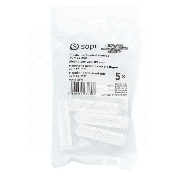SOPI Pack Plastic perforated sleeves 20 × 85 mm (5 pcs/bag) are plastic perforated sleeves designed for anchoring with injection resin in hollow and perforated substrates. The sleeves help keep resin within the anchoring zone, reduce resin loss into voids and support a stable anchor point. The 20 × 85 mm version is a good choice when a larger sleeve diameter is required for anchoring in hollow materials.