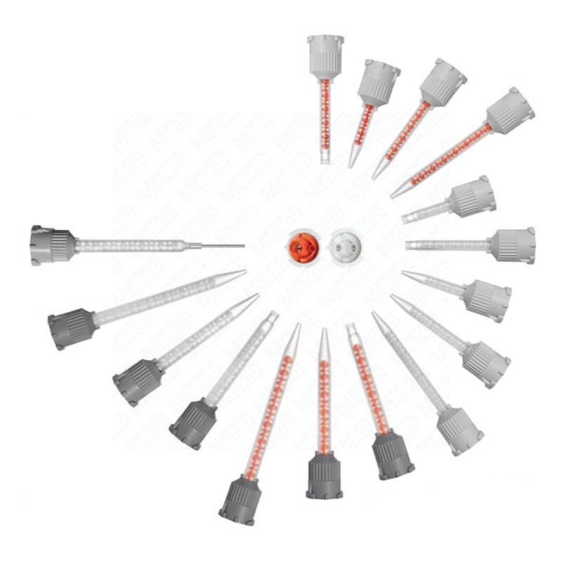 - The mixer nozzles are attached with an interlock connection. This ensures a firm and secure attachment of the nozzle, which is crucial for precise and clean dispensing of glue.