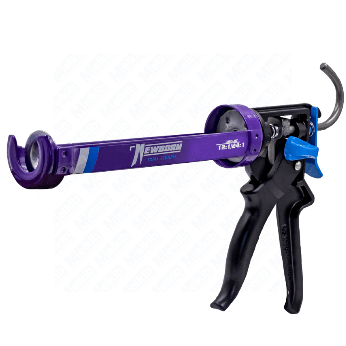 The 360-DT handheld gun for sealants and adhesives with a capacity of 310ml has a 12:1, 24:1 dual-thrust switch. This feature allows the user to adjust the ejection force to the type of material being used. The gun's lightweight design makes it comfortable to use even during long-term work. The gun is equipped with a zinc-plated handle and trigger, which guarantees its durability and corrosion resistance. Additional features such as a seal piercing tool and a ladder hook increase its versatility and practicality.