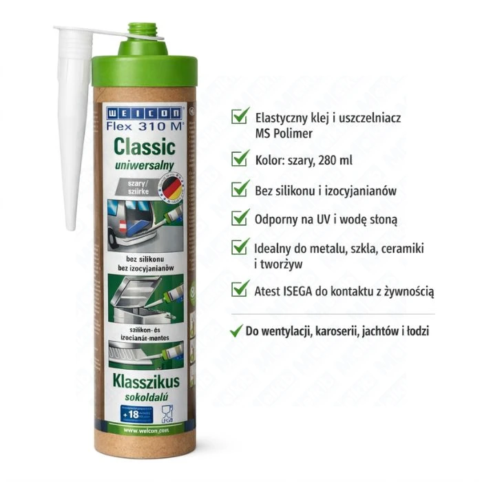WEICON Flex 310 M Classic is a flexible adhesive based on MS Polymer. The manufacturer states that the product is strong, paintable wet-on-wet and highly resistant to ageing, UV radiation, fresh water and salt water. It does not contain silicones, isocyanates, halogens or solvents. The product also has ISEGA approval for use as an adhesive in the food processing sector.