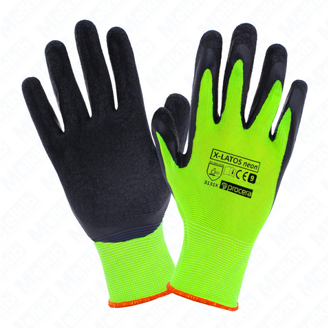 X-LATOS NEON protective working gloves, polyester-latex, flexible, neon green-black (available sizes 7,8,9,10,11)