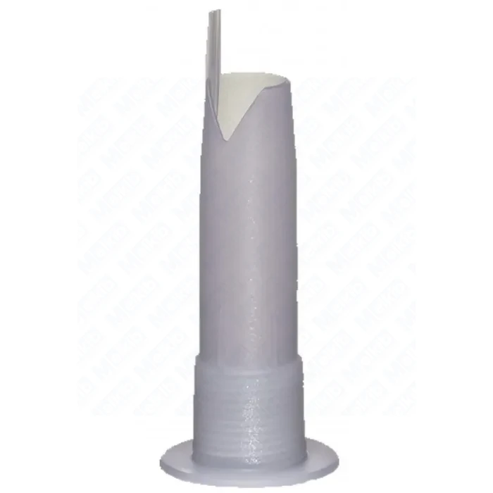 Melkib V-seam with guide pin to dysza kartridżowa z szeroką krawędzią i prowadzącym trzpieniem (guide pin), przeznaczona do aplikacji w kształcie litery V. Wersja z dystansem 9 × 9 mm wspiera powtarzalne prowadzenie spoiny podczas nakładania uszczelniaczy i klejów na powierzchnie. Dysza ma gwint M15 i jest kompatybilna z metrycznymi komponentami gwintowanymi M15.
