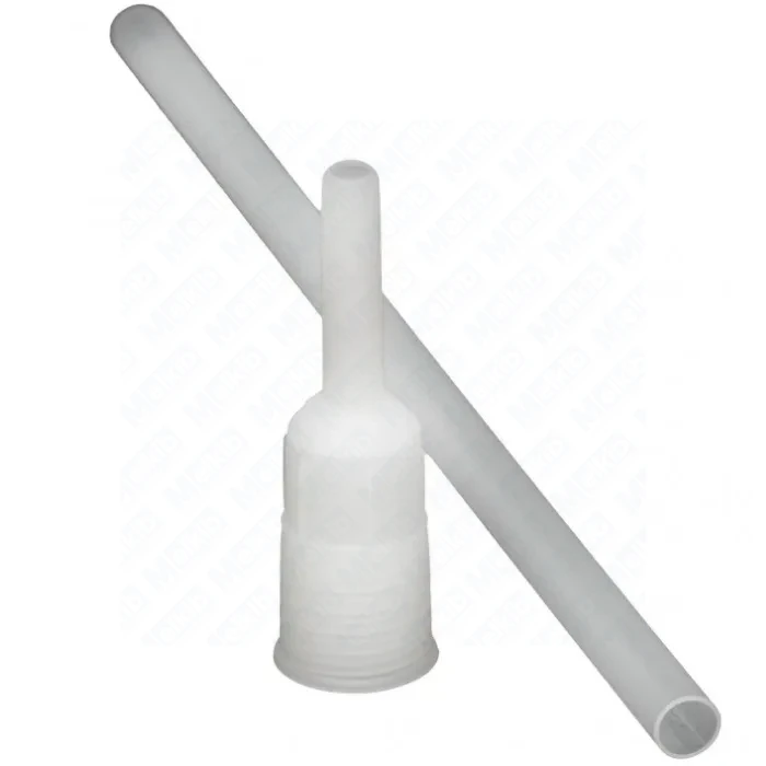 Dysza z wężykiem przedłużającym fi 6 mm, 200 mm, gwint S15 (Melkib Nozzle with hose extension fi6 200 mm) to końcówka z tworzywa HDPE do aplikacji mas w miejscach trudno dostępnych (np. przy oknach, ościeżnicach i wąskich szczelinach). Elastyczny wężyk o długości 200 mm można dociąć do potrzeb, co ułatwia precyzyjne dozowanie na odległość. Dysza pasuje do standardowych komponentów z gwintem S15.