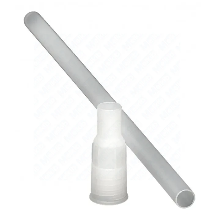 Dysza z wężykiem przedłużającym fi 8 mm, 250 mm, gwint S15 (Melkib Nozzle with hose extension fi8 250 mm) to końcówka z tworzywa HDPE do aplikacji mas w miejscach trudno dostępnych. Elastyczny wężyk o długości 250 mm można dociąć do potrzeb, co ułatwia dozowanie na odległość. Zgodnie z opisem producenta ta wersja sprzyja również aplikacji grubszych warstw materiału. Dysza pasuje do standardowych komponentów z gwintem S15.