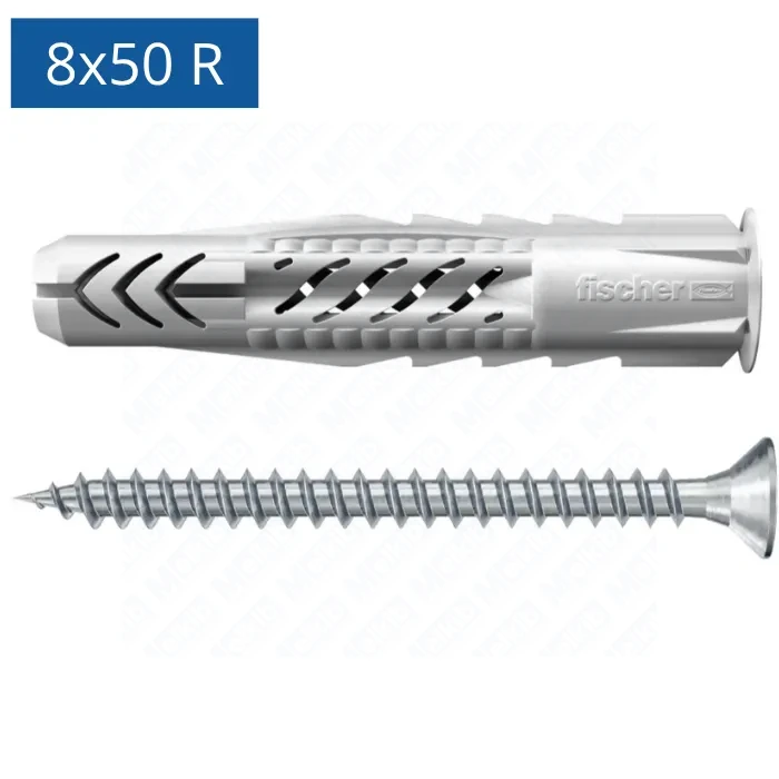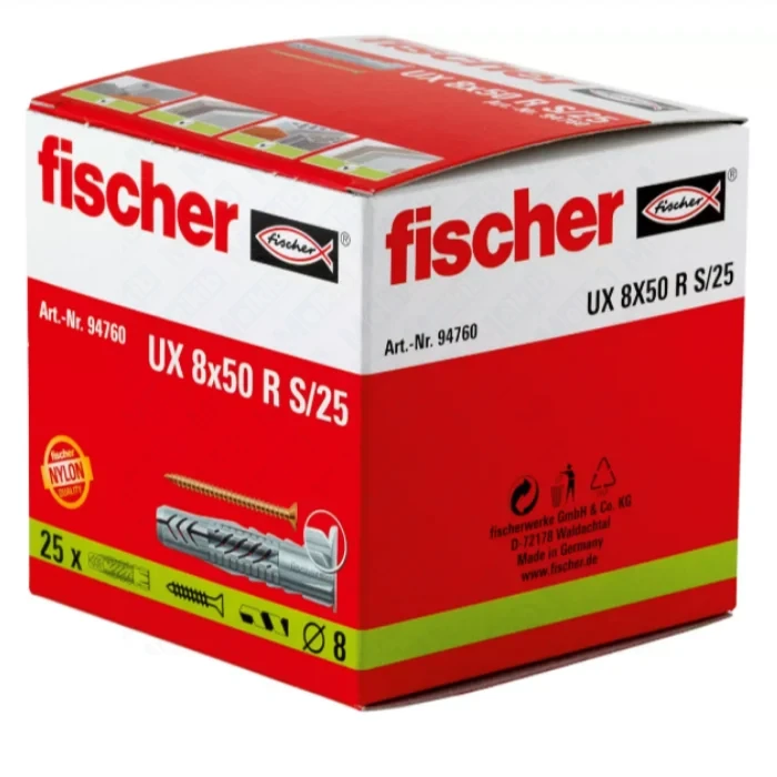 Fischer kołek uniwersalny UX 8×50 z kołnierzem i wkrętem, do betonu, cegły, płyt g-k, zapętlanie i rozpieranie, zestaw 25 sztuk
