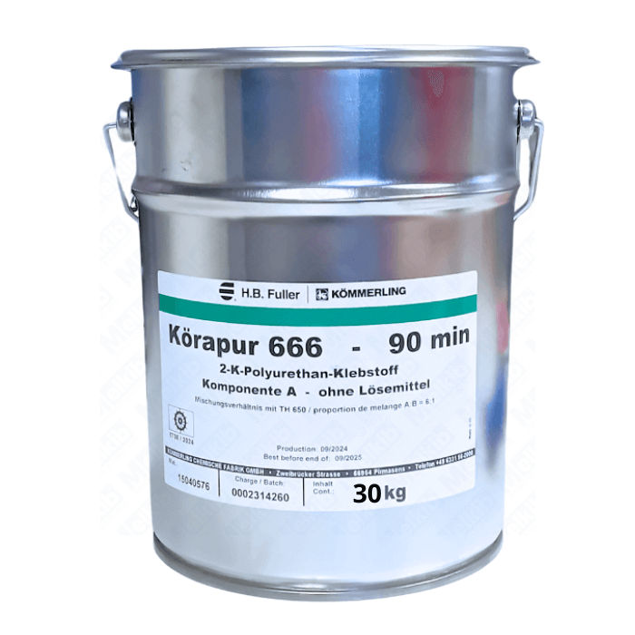 Korapur KPU 666/90 LQ 30kg dwuskładnikowy klej poliuretanowy, elastyczny, wysoka wytrzymałość mechaniczna, odporność na wilgoć, do przyczep campingowych, łodzi, kontenerów.