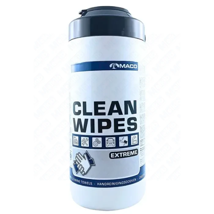 Maco CLEAN WIPES EXTREME to wysokowydajne chusteczki czyszczące przeznaczone do usuwania uporczywych zabrudzeń z różnych powierzchni i rąk. Zostały nasączone silnie działającą formułą z dodatkiem alkoholu izopropylowego oraz d-limonenu, który zapewnia skuteczne działanie czyszczące i przyjemny, cytrusowy zapach. Każde opakowanie zawiera 100 chusteczek o wymiarach 20x23 cm, zamkniętych w praktycznym i szczelnym słoju, chroniącym przed wysychaniem.