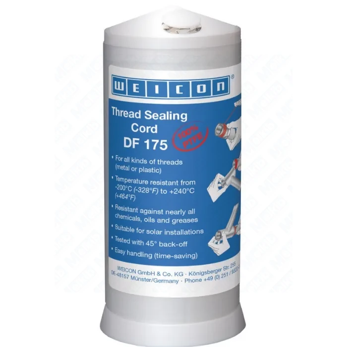 WEICON DF 175 175 m to nić uszczelniająca do gwintów wykonana w 100% z PTFE, przeznaczona do uszczelniania połączeń gwintowanych z metali oraz tworzyw sztucznych. Zapewnia trwałe, szczelne połączenie i jest odporna na większość chemikaliów, w tym agresywne rozpuszczalniki, zasady i kwasy. WEICON DF 175 pracuje w szerokim zakresie temperatur od -200°C do +240°C, dlatego sprawdza się także w wymagających instalacjach.