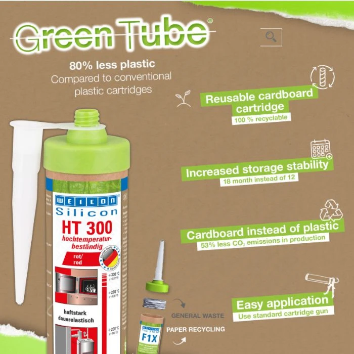 WEICON Green Tube Silicone HT 300 to zestaw z czerwonym uszczelniaczem wysokotemperaturowym przeznaczonym do aplikacji narażonych na działanie bardzo wysokich temperatur. Ten wariant lokalny występuje pod numerem 10104430 i kodem EAN 4024596690649. Jego głównym wyróżnikiem jest kompletny zestaw aplikacyjny z pustą tubą Green Tube, trzema wkładami foliowymi, dyszami i instrukcją obsługi.