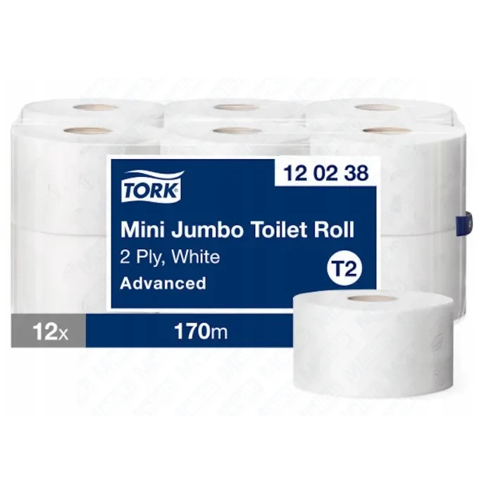 TORK Mini Jumbo T2 papier toaletowy biały 170 m to wydajny papier w rolce do łazienek o średnim i dużym natężeniu ruchu. Jedna rolka ma 170 m długości (850 odcinków), co ogranicza częstotliwość wymiany i ryzyko braku papieru. Wariant 2-warstwowy łączy dobrą chłonność z wytrzymałością, dzięki czemu sprawdza się w obiektach publicznych i firmach.